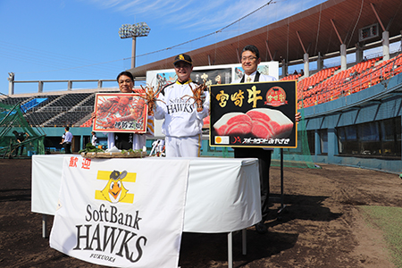 天気も良く、キャンプ日和となった初日、ホークス宮崎協力会より、秋季キャンプの激励を兼ねて、宮崎特産品が贈呈されました。