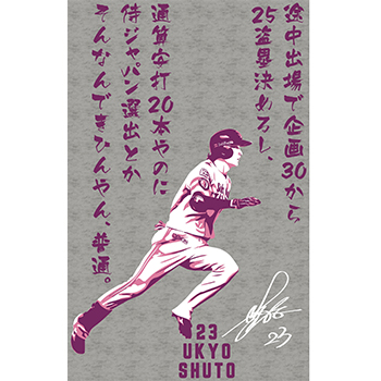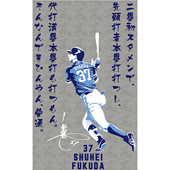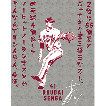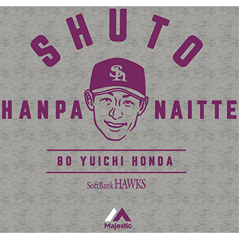 和田毅投手×福田秀平選手、甲斐拓也選手×千賀滉大投手、本多雄一コーチ×周東佑京選手の3型で、和田投手・甲斐選手・本多コーチから見た各選手の魅力を、あの有名なセリフにのせてデザインしたTシャツです。