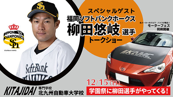 令和元年12月15日(日)専門学校北九州自動車大学校の学園祭にて、柳田選手のトークショーを開催します!観覧ご希望の方は、同校ホームページの手順に沿ってご応募ください。学園祭は10:00~16:00まで開催し、模擬店や各種メーカーのモーターフェス、バイクのエクストリームショーもお楽しみいただけます。トークショーは抽選当選者のみ入場可能のため、奮ってご応募ください !
