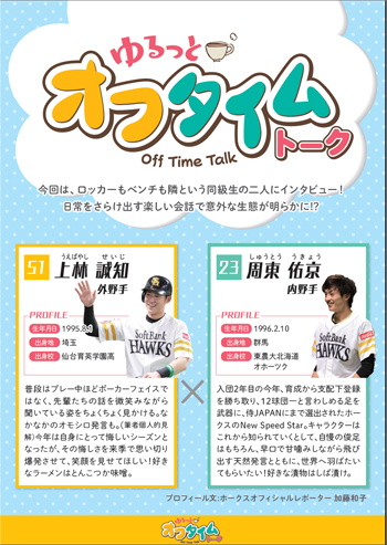 ロッカーもベンチも隣の同級生コンビ・上林誠知選手、周東佑京選手が、出逢った頃のお互いの印象や、プライベートについて話してくれました♪