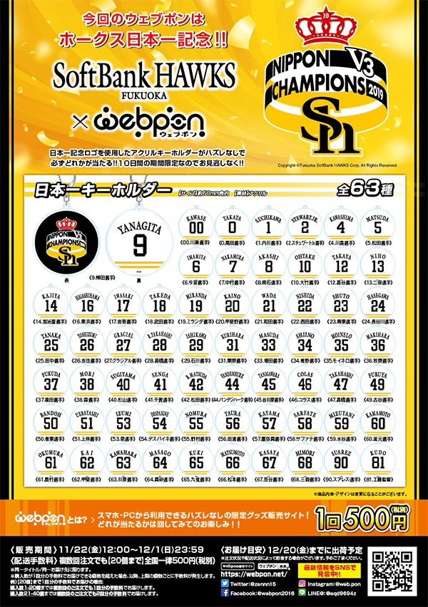 『ウェブポン』から【ホークス2019~日本一編~】が発売決定!!日本一記念ロゴを使用したアクリルキーホルダーが全63種からハズレなしで必ずどれか当たる!12/1(日)23:59までの期間限定なのでお見逃しなく!!