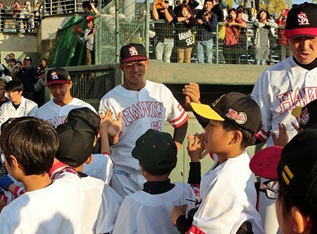 たとえば福岡・雁の巣会場には松田宣浩選手、タマスタ筑後会場には川島慶三選手や中村晃選手、佐賀会場には東浜巨投手や森唯斗投手、大分会場には今宮健太選手や甲斐拓也選手、鹿児島会場には千賀滉大投手や周東佑京選手、山口会場には甲斐野央投手や髙橋純平投手と、各地の会場でホークス現役選手5名ずつが講師として登場しました。そして各会場300名前後の子どもたちに野球の技術を伝授したり、一緒に動きまわって遊んだりと楽しい1日を過ごしました。