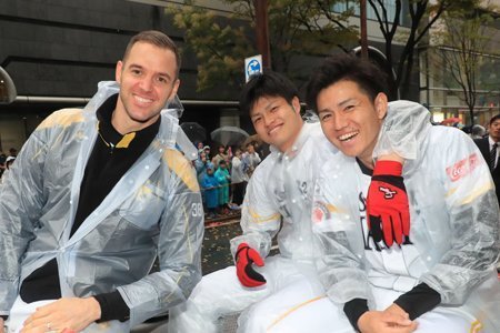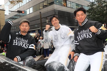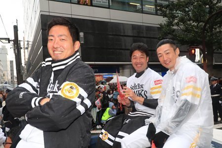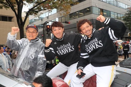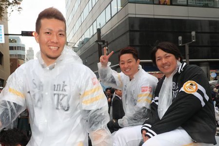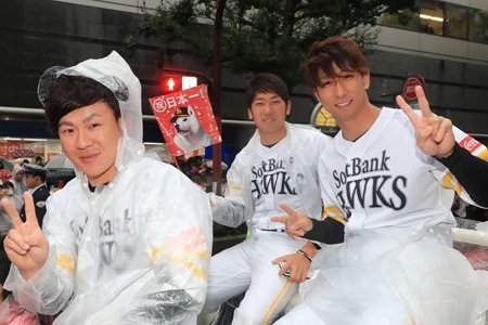 内川聖一選手と松田宣浩選手もニコニコ顔で「雨のパレードだったけど、たくさんの人に来てもらい、思い出に残りました」と声を揃えました。松田宣選手は「今シーズンのホームランは30発だったけど、(パレード中の)オープンカーの上で50熱男を決めました。100点満点です!」と恒例のポーズで声援に応えていました。