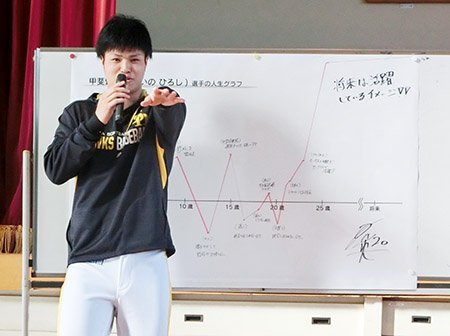 甲斐野投手と板東投手は、自らの「人生グラフ」を作成し、それをもとにして「夢」をテーマに講話を行い、児童たちの質問に応えました。