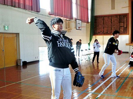 その中の一環として、オフシーズンは筑後市の若鷹寮で生活をする若手選手が地元地域の学校の訪問を行っています。
