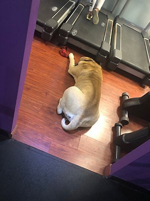 日本のジムではあり得ない事があり、とても大きな犬が飼い主さんのジョギングを終わるのをいい子に待ってました。