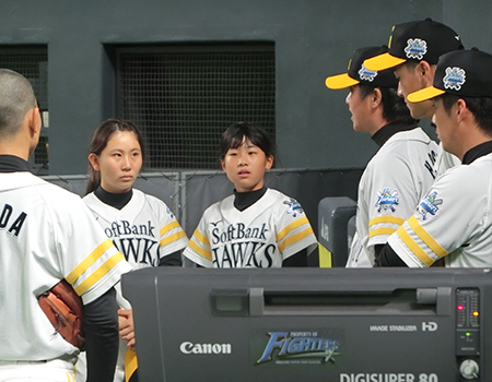 先発した松田長磨選手は110キロ台後半の直球を中心に4回まで1安打しか許さなかった。しかし、その一本が痛恨の2ランだった。2番手の黒田悠斗選手は、味方中堅の豊田雅楽選手の好返球もあり無失点投球。六回には女子選手の中島聖世良選手もマウンドに上がった。