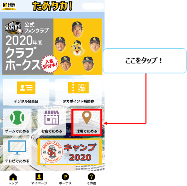 ③トップ画面の「球場でためる」をタップ!