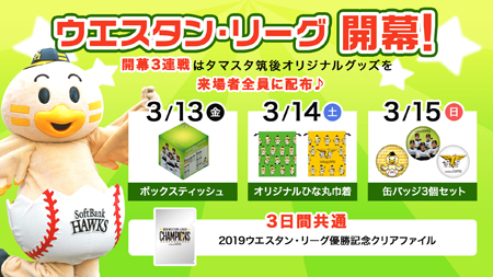 タマスタ筑後で開催される2020年ウエスタン・リーグ日程表が入った『オリジナルティッシュボックス』や、『ひな丸オリジナル巾着』、2020年度新入団選手がデザインされた『缶バッジセット』を来場者全員に配布します。