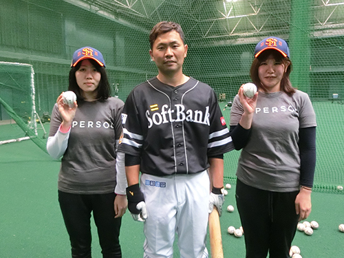 今回は中村晃選手のティー打撃のお手伝い。ボールを素早く設置して、それを中村晃選手が打つ。そしてタイミングよく次のボールを置く。単純に見えて、じつはチームワークが大切なこの共同作業を、2人には行っていただきました。