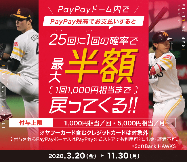 福岡ソフトバンクホークス株式会社、ソフトバンク株式会社およびPayPay株式会社は、福岡PayPayドーム(福岡市中央区、以下「PayPayドーム」)の来場者向けに、今年のPayPayドーム開催のプロ野球公式戦がスタートする2020年3月20日(金)から「PayPayドームならPayPayでおトク!キャンペーン」を実施します。「PayPayドームならPayPayでおトク!キャンペーン」では、5,000円相当を1カ月の上限として、25回に1回の確率でPayPay残高での支払額の半額がPayPayボーナスで付与される「PayPayドームくじ」など3つのキャンペーンを実施します。