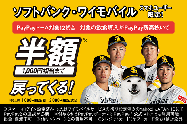 特定の試合開催日において、“ソフトバンク”および“ワイモバイル”のユーザーが、フード・生ビール、アイスクリームを購入の際、PayPay残高を利用して支払うと、会計金額の半額(1回につき1,000円相当まで)がPayPayボーナスとして付与されます。