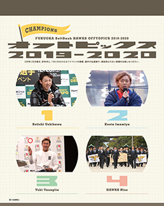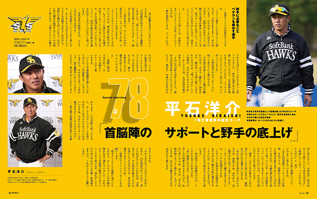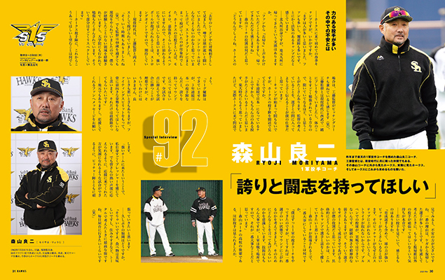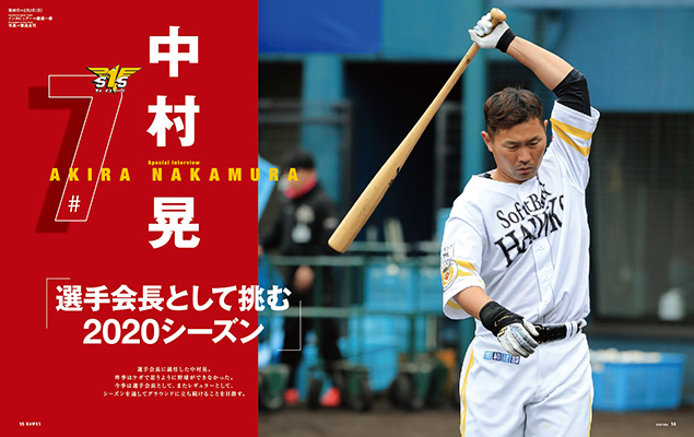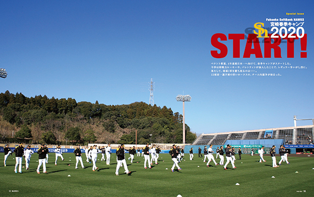 巻頭では、春季キャンプを大特集。レギュラーを目指し、投手、野手ともにアピール合戦がスタートしました。まずは投手を代表して、和田毅投手へインタビュー。「1年間ローテーションで投げたい」と、昨年、一昨年とケガで悔しい思いをした分、今季にかける熱い思いをたくさん語ってくれています。また、打者を代表して中村晃選手にもインタビュー。今季から選手会長に就任した中村晃選手。どんなチームを作っていきたいのか、選手会長としての意気込みを聞きました。さらに個人としては、「1年間試合に出続けることがレギュラーだと思う」と、こちらも昨季ケガで離脱した悔しい思いを、今季にぶつける熱い気持ちで語ってくれています。