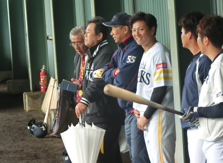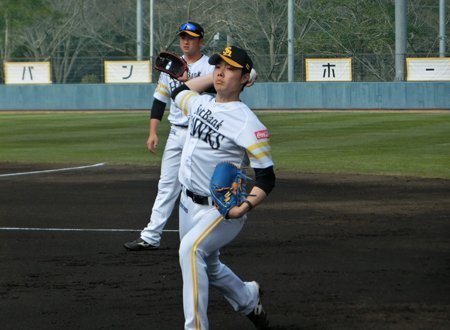 22日(土)のA組は通常練習。翌23日(日)のオープン戦初戦(対バファローズ・SOKKEN)で登板予定の東浜巨投手はブルペンでピッチングを行い、「相手は同じリーグなので、シーズンで対戦する機会も多い。いろんなものを見られると思う」と話し、「自分にとってもチームにとっても大事な登板になる」と位置づけについて説明しました。