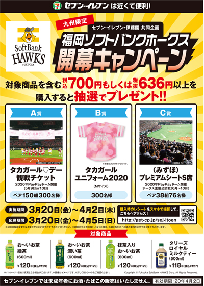3月20日(金)から九州のセブン-イレブン各店舗で伊藤園の対象商品を含む「税込700円以上、もしくは税抜636円以上のレシート」で、「タカガール♡デー観戦チケット」がペア150組300名様に当たるほか、「タカガールユニフォーム2020」が300名様に、「<みずほ>プレミアムシートS席」がペア38組76名様に当たります!