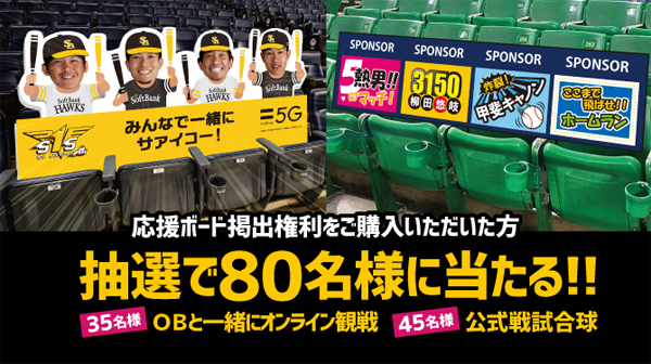 現在、好評販売中の「オリジナル応援ボード掲出権利」を購入された方の中から抽選で、合計80名の方にOBと一緒にオンライン観戦ができる権利や、実際の試合で使用された試合球が当たるキャンペーンを実施します!