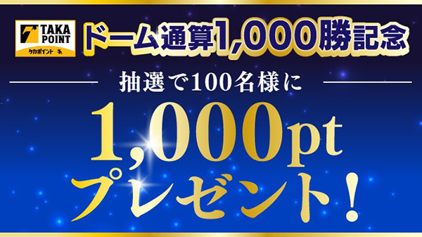 ドーム通算1,000勝を記念して、期間中に1回のお申込みでタカポイント3,000pt以上交換いただいた方から抽選で100名様に1,000ptをプレゼント!