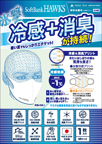 また、本格的な夏に備えて、ひんやりマスクはいかがですか?涼しい接触冷感素材を裏地に使った冷感マスクカバーを始め、氷撃冷感プリントを施したエチケットマスクとネックゲイターもご案内♪さらに、HAWKS STORE PayPayドーム店では、キャップ圧着サービスを実施中です!