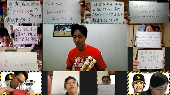 イベント序盤は、「城所さんによる試合解説」や「城所さんへの質問タイム」、「城所さんが選ぶスタメン・開幕ローテーション」などのトーク中心で進行。松田宣浩選手とのプライベートでの裏話や、選手時代のエピソード、自粛期間中の過ごし方なども話して頂きました。