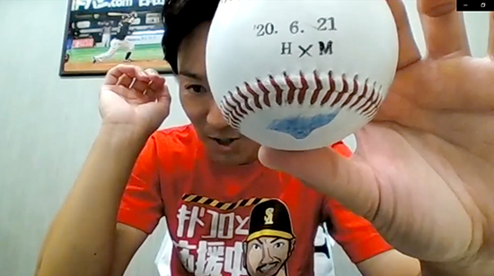 また、5回裏終了時には「ファンによるホークスお宝自慢バトル」を開催!ファンの皆さんが持ち寄ったホークスゆかりのお宝を画面越しにアピール!お宝にまつわる思い出話などを皆さんと共有し、城所さんとの交流を楽しみました。