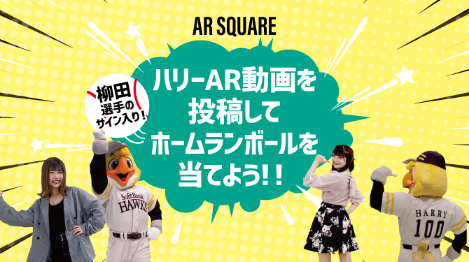 7月3日(金)~7月12日(日)の期間中、「AR SQUARE」アプリでハリーホークと一緒に動画を撮影し、SNSに投稿頂いた方の中から、抽選で1名様に、開幕2戦目の6月20日(土)に放った今シーズン第1号の柳田悠岐選手のサイン入りホームランボールをプレゼント!試合中やホームラン直後の投稿で当選確率はアップします。皆さんの投稿をお待ちしております♪
