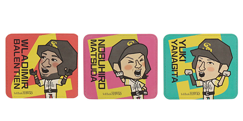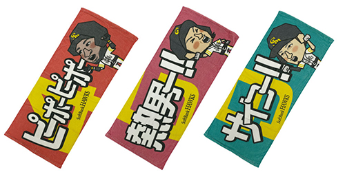 バレンティン選手の「ピーポーピーポー」、松田宣浩選手の「熱男」、柳田選手の「サイコー」等、ホームラン後のパフォーマンスをカクカクホークスのキャラクターでデザインしたかわいいグッズが登場!