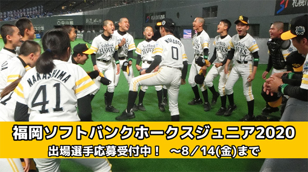 NPB12球団ジュニアトーナメント2020に出場する選手募集の締切を8月14日(金)まで延長します!九州エリア・山口県に在住する小学校5年生・6年生が対象です♪福岡ソフトバンクホークスの一員としてプロ野球12球団ジュニアチームの頂点を目指そう!