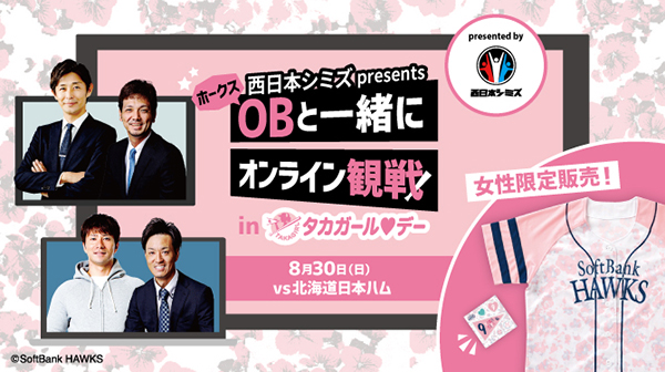 8月30日(日)北海道日本ハムファイターズ戦にて、「西日本シミズ presents OBと一緒にオンライン観戦 inタカガール♡デー」を開催します。タカガールたちのおうち観戦を盛り上げるため、ゲストとして「馬原孝浩さん&城所龍磨さん」と「江尻慎太郎さん&新垣渚さん」が登場!4名のOBが2部屋に分かれて、一緒に野球観戦や賞品が当たるミニゲームなどを楽しみます。「女性限定」で8月19日(水)13:00からタカチケットにて参加権利を販売します。参加権利を購入いただいた方には、もれなく「タカガールユニフォーム2020(Lサイズ)」などの参加特典をイベント前日までに、タカポイントにご登録の住所宛てにお届けいたします。