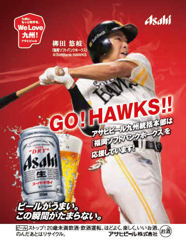 アサヒビール九州統括本部では、「アサヒスーパードライスペシャル2020」のPRに、福岡ソフトバンクホークス所属の柳田悠岐選手を起用します。柳田選手は、アサヒビールが協賛する公式戦「アサヒスーパードライスペシャル2020」当日のポスター、動画での広告やスクラッチチャレンジ告知広告など各種プロモーションで登場します。