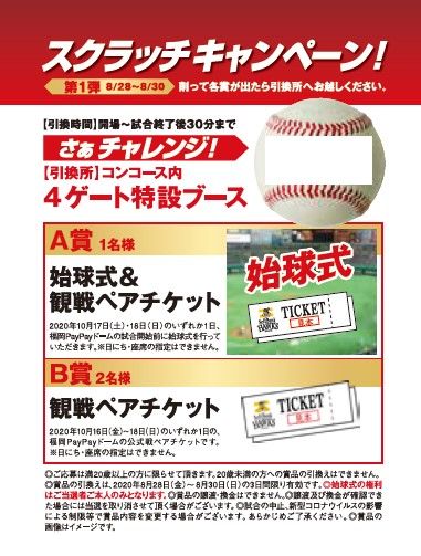 開催当日、PayPayドーム売店にてアサヒスーパードライの生ビールを購入していただいたお客様にスクラッチカードを進呈。 スクラッチカードを削って当たると、豪華賞品が当たるキャンペーンを実施致します。