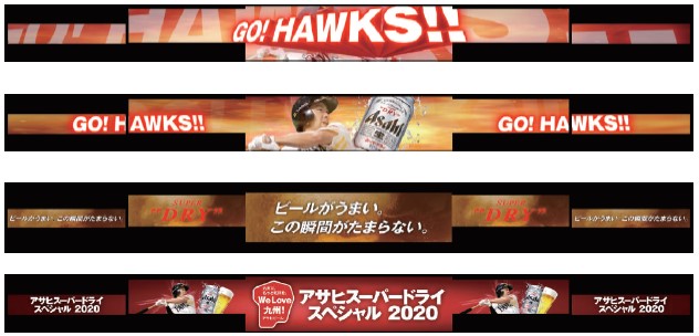 8月28日(金)には、試合開始冒頭やホークスに得点が入るとバックスクリーンビジョンに、アサヒスーパードライオリジナル動画が流れます。また、5回イニング間などには、ホークス応援メッセージの動画が流れます。