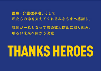 今年の鷹の祭典は「THANKS HEROES」をテーマに、新型コロナウイルスと献身的に対峙していただいている医療従事者の皆さまへ感謝を伝えるとともに、感染拡大防止の啓発活動に取り組みます。この度、これまでの感謝と今後の活動に対する決意の証として、福岡県、および福岡県医師会のご協力をいただき、県内の医療従事者の皆さまへユニフォームを贈呈させていただく運びとなりました。医療従事者の皆さまに続いて、わたしたちが「ヒーロー」となれるよう、選手とファンが一丸になって感染拡大防止に取り組み、明るい未来を目指します。
