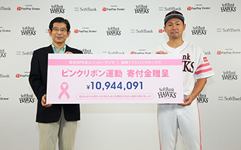 2019年度「タカガール♡デー」において実施した、「ピンクリボンチャリティオークションの収益」・「ピンクリボングッズ販売による売り上げ(一部)」と、中村晃選手による寄付金は、認定NPO法人ハッピーマンマへ寄付させていただきました事をご報告いたします。