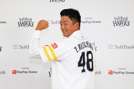 8月31日(月)、渡邉雄大投手が支配下登録されることになり、オンライン会見が行われました。これに伴い、渡邉投手の背番号は「140」から「48」へ変更となります。また、ホークスで育成枠から支配下登録されたのは32人目(33例目)となりました。
