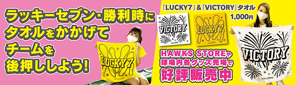 HAWKS STORE PayPayドーム店では、明日9月4日(金)から「LUCKY7&VICTORYタオル」が新登場!ジェット風船に変わる新しい応援スタイル!おなじみの黄色のジェット風船がデザインされた「LUCKY7タオル」と、勝利の花火が描かれた「VICTORYタオル」を2枚セットで発売します。