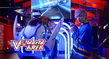 EXITのお二人のイチオシは「V-World AREA」!「フォトンバイク」に挑戦したりんたろー。さんは、あまりのリアリティに絶叫しながら楽しんでいました!