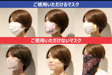 9月11日(金)以降の公式戦においてNPBガイドラインに基づき、場内で使用いただけるマスクの種類および着用方法をご案内いたします。マスク未着用のお客様、または下記のマスクの種類および着用方法と異なるお客様を確認した場合、係員よりお声掛けさせていただきますので、予めご了承ください。ご来場いただくファンの皆さまとスタッフの健康と安全の確保を最優先し、安心して野球観戦を楽しめる環境を整えるため、衛生対策強化へのご理解・ご協力を頂きたくお願い申し上げます。