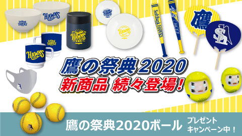 鷹の祭典2020グッズ好評発売中!応援グッズはもちろん、HAWKSの文字をカジュアルにデザインしたマグカップやカレーボウルなどおうちでも鷹祭気分を楽しめるグッズが多数ラインナップ♪<白河だるま総本舗>にて作成された鷹の祭典ユニフォームを纏ったスペシャル仕様の“必勝だるま”も必見です。