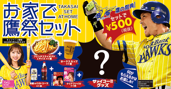 セット内容は【キリン淡麗350ml1缶orコカ・コーラ500ml1本+フレンチフライポテトL+ホークスカップ+特製クリアファイル】でなんと500円(税抜)!さらに「お家で鷹祭セット」お買い上げの方にはもれなくサァイコーグッズをプレゼント!鷹の祭典ユニフォーム2020(レピリカ)やピザクック・ソフトバンクホークス特製タオル、鷹祭うちわなどサァイコーなグッズのどれが貰えるかは届いてみてのお楽しみ!