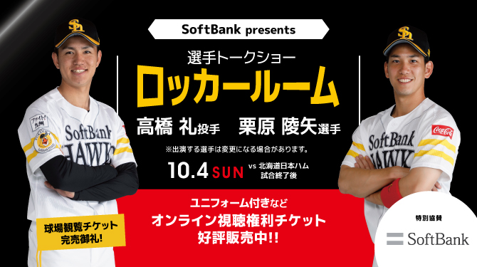 10月4日(日)北海道日本ハムファイターズ戦の試合終了後に、SoftBank presents 「ロッカールーム」を開催します!登場する選手は、高橋礼投手と栗原陵矢選手です。今シーズン活躍を続ける両選手からどんな話が聞けるかお楽しみに!ロッカールーム入場券と当日の野球観戦チケット(A指定席引換券)がセットになったお得なチケットや、オンラインで視聴できるチケット、ユニフォーム付きチケットなど様々なチケットを9月25日(金)からタカチケットにて販売します。どれも枚数限定・先着順での販売となっておりますので、購入はお早めに!