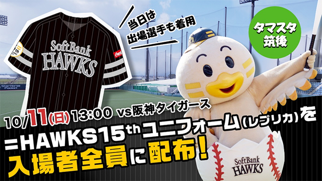 10月11日(日)の阪神タイガース戦では、「=HAWKS15thユニフォーム(レプリカ)」を入場者全員に配布します!前回GET出来なかった方もこの機会に是非!