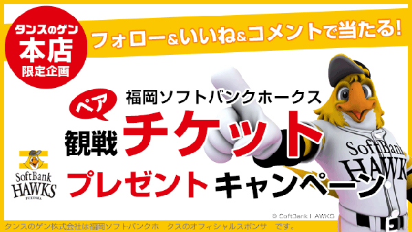 タンスのゲンでは公式インスタグラムにて抽選で3組6名様に、ペア観戦チケットが当たるプレゼントキャンペーンを実施!対象の試合は、10/17(土)・10/25(日)・10/28(水)となっています。応募は10/4(日)まで。タンスのゲンと一緒にホークスを応援しましょう!皆様からのご応募お待ちしております。