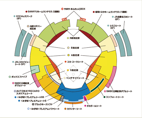 | JA全農なごみシート ※3 6F1塁側 | ¥6,800 | ¥7,200 | ¥6,300 | ¥6,700 | ¥5,700 | ¥6,200 | |