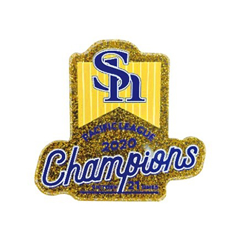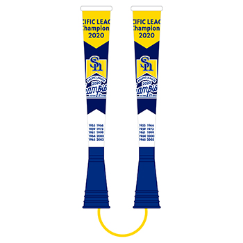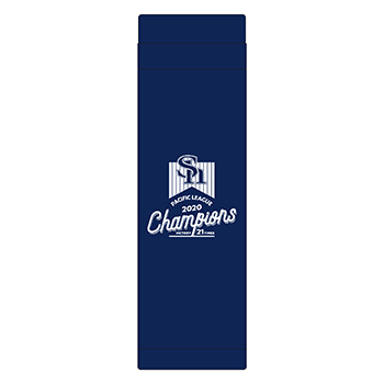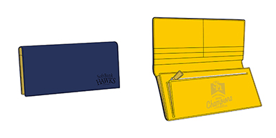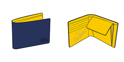 各50個限定!2020年パ・リーグ優勝記念ロゴデザインの折財布と長財布です。表面はネイビーベースにさりげなくオフィシャルロゴが入った、普段使いしやすいシンプルなデザインです。 折財布の内側はイエローベースにPACIFIC LEAGUE 2020 Championsの文字がデザインされております。長財布の内側はイエローベースに優勝ロゴがデザインされております。