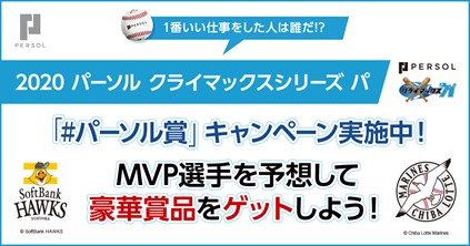パシフィックリーグマーケティング株式会社(本社:東京都中央区、代表取締役CEO:根岸 友喜)は、2020年度パシフィック・リーグオフィシャルスポンサーである総合人材サービスのパーソルホールディングス株式会社(本社:東京都港区、代表取締役社長 CEO:水田 正道)が、「2020 パーソル クライマックスシリーズ パ」のMVP選手を予想すると、抽選で豪華賞品が当たるTwitterキャンペーンを開始することをご案内いたします。