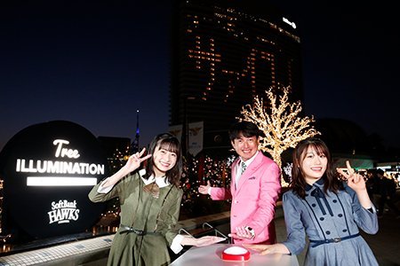 PayPayドーム7ゲート前「ホークスみんなのガーデン」にイルミネーションが登場しました。11月13日(金)に点灯式が実施され、ガーデニングコンテストにも参加したお笑いコンビ「レモンティー」のあべてつあきさんがMCを務め、「HKT48」の松岡はなさん、小田彩加さんもゲストに迎えて華々しく行われました。