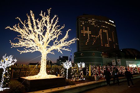 「ホークスみんなのガーデン」は2019年に誕生し、2度目の冬を迎えるところです。しかし、季節柄どうしても温かい時期に比べると寂しさが否めませんでしたが、光り輝くイルミネーションが誕生し、PayPayドームの外周デッキが一気に見違えるほど華やぎました。2月末まで実施される予定です。また、この日に合わせて「ヒルトン福岡シーホーク」にて窓文字(サァイコー!)の点灯も行われました。