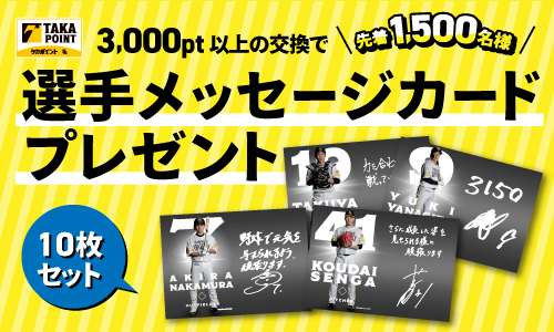 タカポイント交換で、配送対象商品を3,000pt以上交換された先着1,500名様に選手からのメッセージがプリントされた「選手メッセージ入りカード(10枚セット)」をプレゼントします。メッセージカードは交換商品と一緒にお届けします。