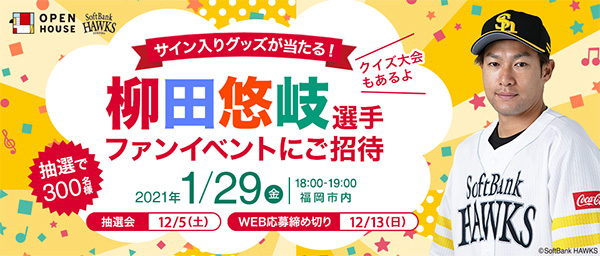 2021年1月29日(金)18時00分から、柳田悠岐選手のファンイベントを開催します。柳田悠岐選手のトークショーやクイズ大会など参加者に楽しんでもらえるイベントです。シーズン中にはなかなか見られない一面をお楽しみください。
