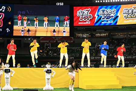 PayPayドーム会場で選手たちが3チーム(「山笠レッド」「どんたくブルー」「放生会イエロー」)に分かれて、対抗方式で勝敗を競い合いました。